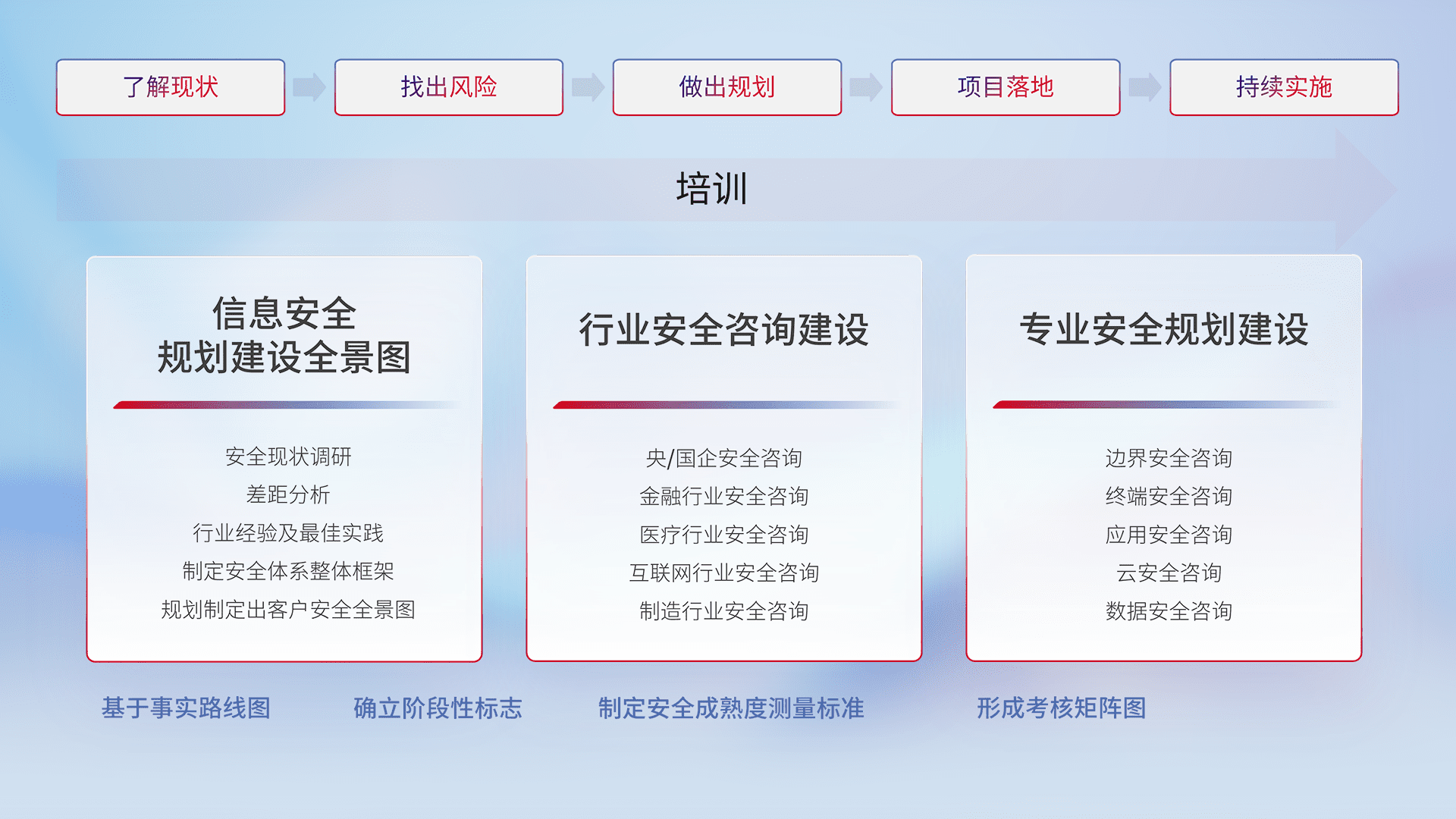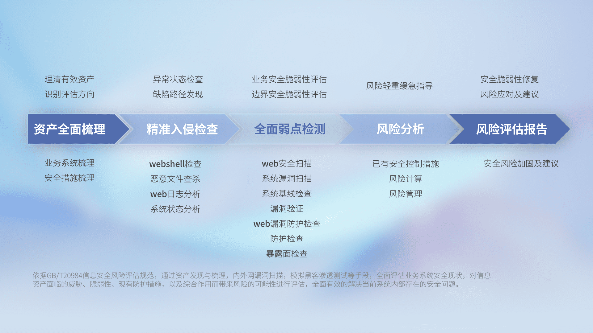 针对客户行业特性,,,,以专业的安全服务+多厂商联合解决方案提供专属的一站式安全管理服务,,,帮助客户全面感知网络空间威胁,,,基于识别、、、、检测、、、分析、、、、防护、、、、监测、、、响应的服务理论模型,,,从方案咨询、、、、集成交付、、、、评估验证、、、优化加固、、、、运维运营,,致力于为客户提供完整的闭环管理式安全服务。。以实战经验为客户打造高抵御风险的安全体系,,帮助客户发现威胁、、对抗威胁、、处置威胁,,不断积累安全对抗能力,,,持续保障数字化安全。。