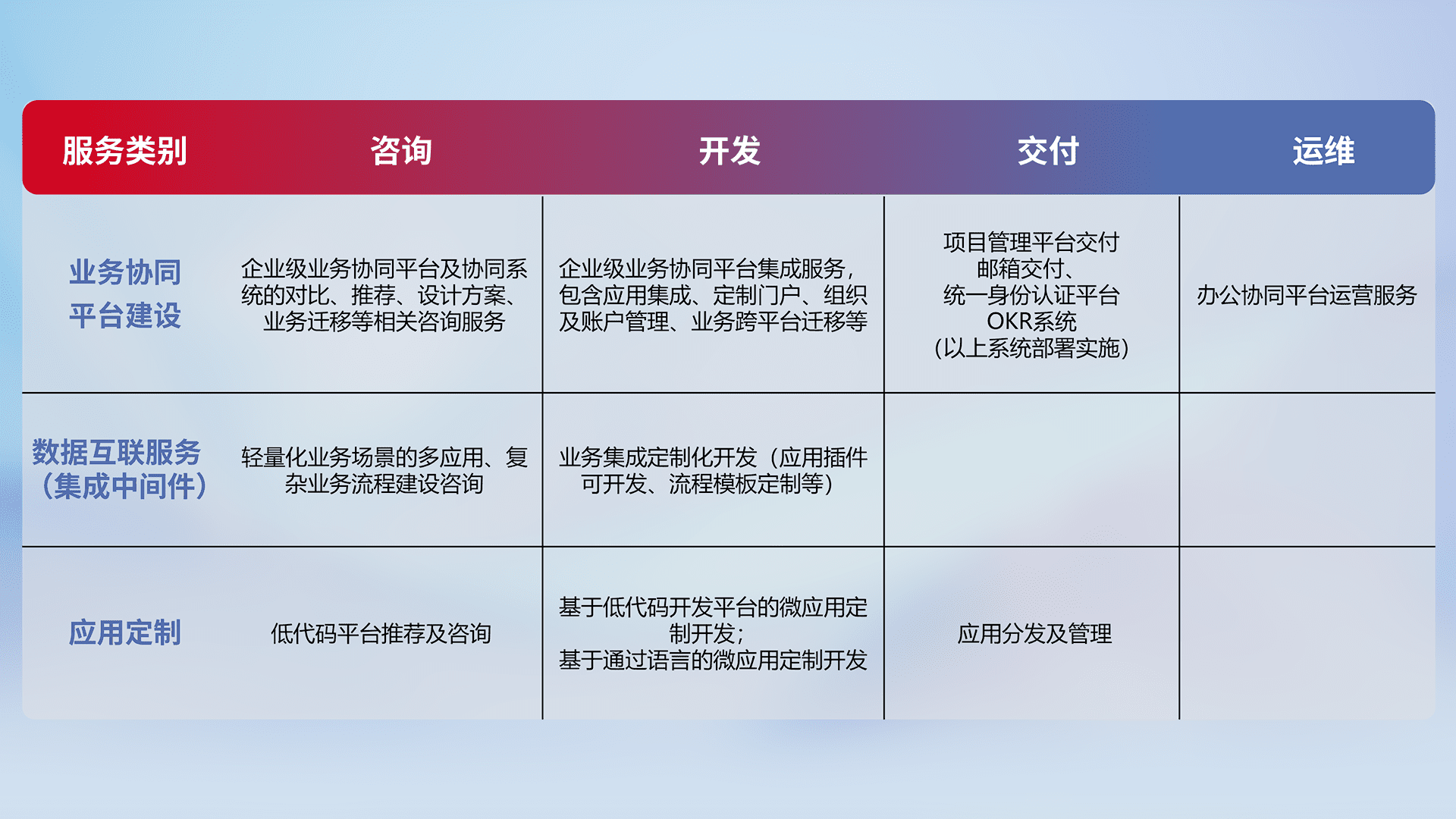 针对钉钉、、、、企微、、、、IDaas等平台级产品提供产品的规划、、、、方案、、交付、、、定制化开发等服务,,,实现如统一协同办公、、、、智能客户服务、、、混合会议管理、、、、智能数据查询、、、、等业务场景,,,,实现数字化转型。。